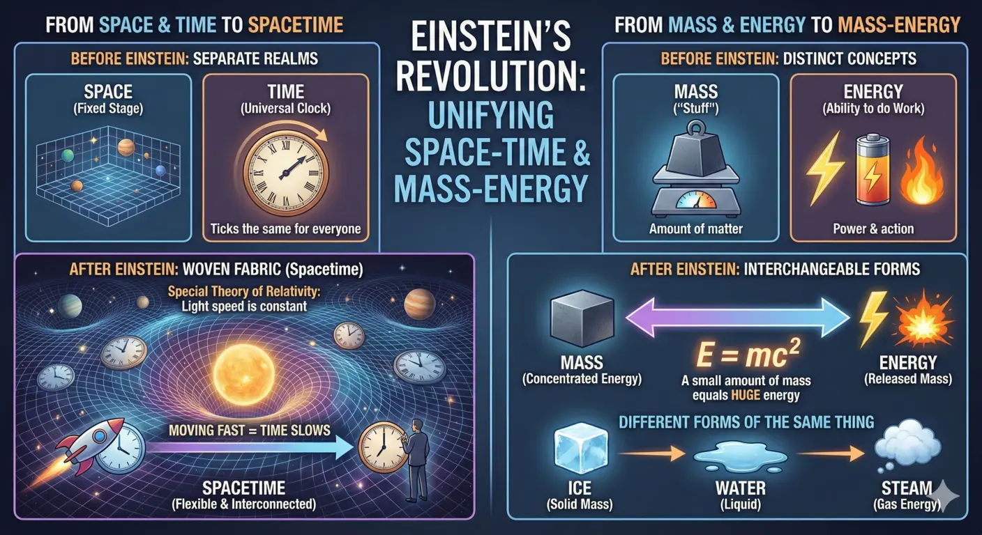 This new way of thinking also connected matter and energy. Previously, people thought mass (how much “stuff” is in an object) and energy (the ability to do work) were totally different and could not change into each other. Einstein discovered that mass is really just a super-concentrated form of energy. His famous equation, $E=mc^2$, explains this relationship. It shows that a very small amount of mass is equal to a huge amount of energy. This proved that matter and energy are essentially the same thing in different forms, similar to how ice and steam are both just different forms of water.