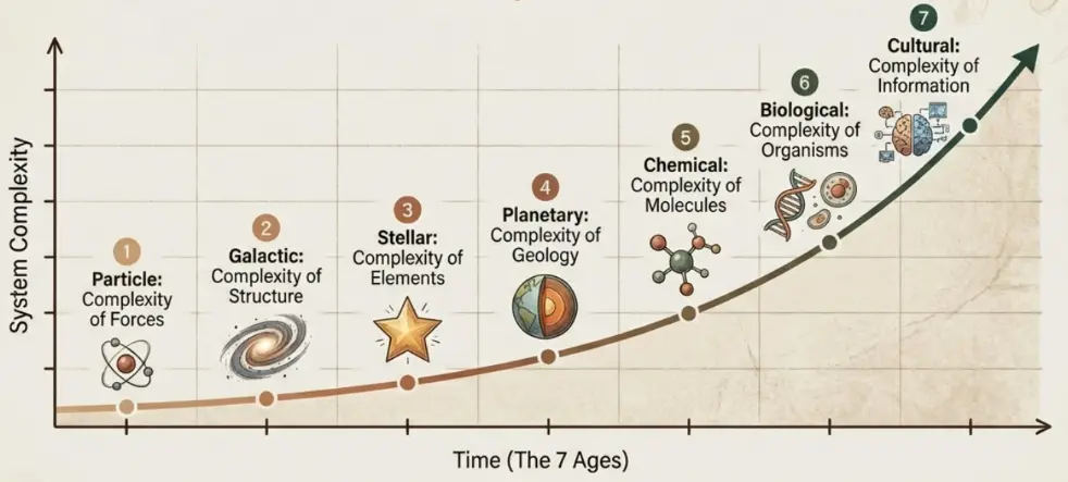 This localized order allows complexity to arise through the flow of energy, a process quantified by “energy rate density“—the amount of energy passing through a system per unit of mass over time. As the universe evolved through the Galactic, Stellar, and Biological Ages, the density of energy flow in complex systems increased dramatically. Surprisingly, while stars possess immense total energy, their energy density is lower than that of living organisms, and modern human society generates the highest energy rate density of all known systems. This rise in complexity is not guaranteed; it occurs only within “Goldilocks circumstances,” where energy flows and environmental conditions are perfectly balanced to sustain intricate structures against the relentless tide of entropy.