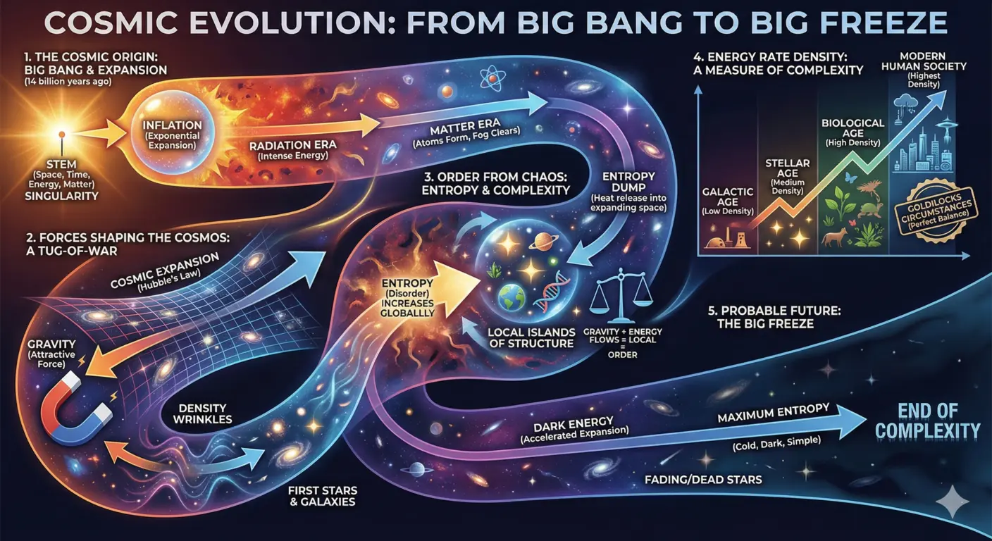 Despite this rise in complexity, current observations suggest the universe will likely expand forever rather than recollapse. The discovery of “dark energy,” a mysterious repulsive force that constitutes the majority of the universe’s energy density, indicates that cosmic expansion is accelerating. As galaxies drift farther apart and stars eventually exhaust their nuclear fuel, the universe is expected to become cold, dark, and simple, eventually reaching a state of maximum entropy. In this probable future, known as the “Big Freeze,” energy gradients will flatten out, rendering the formation of any further complexity impossible, bringing the grand narrative to a silent, frozen conclusion.