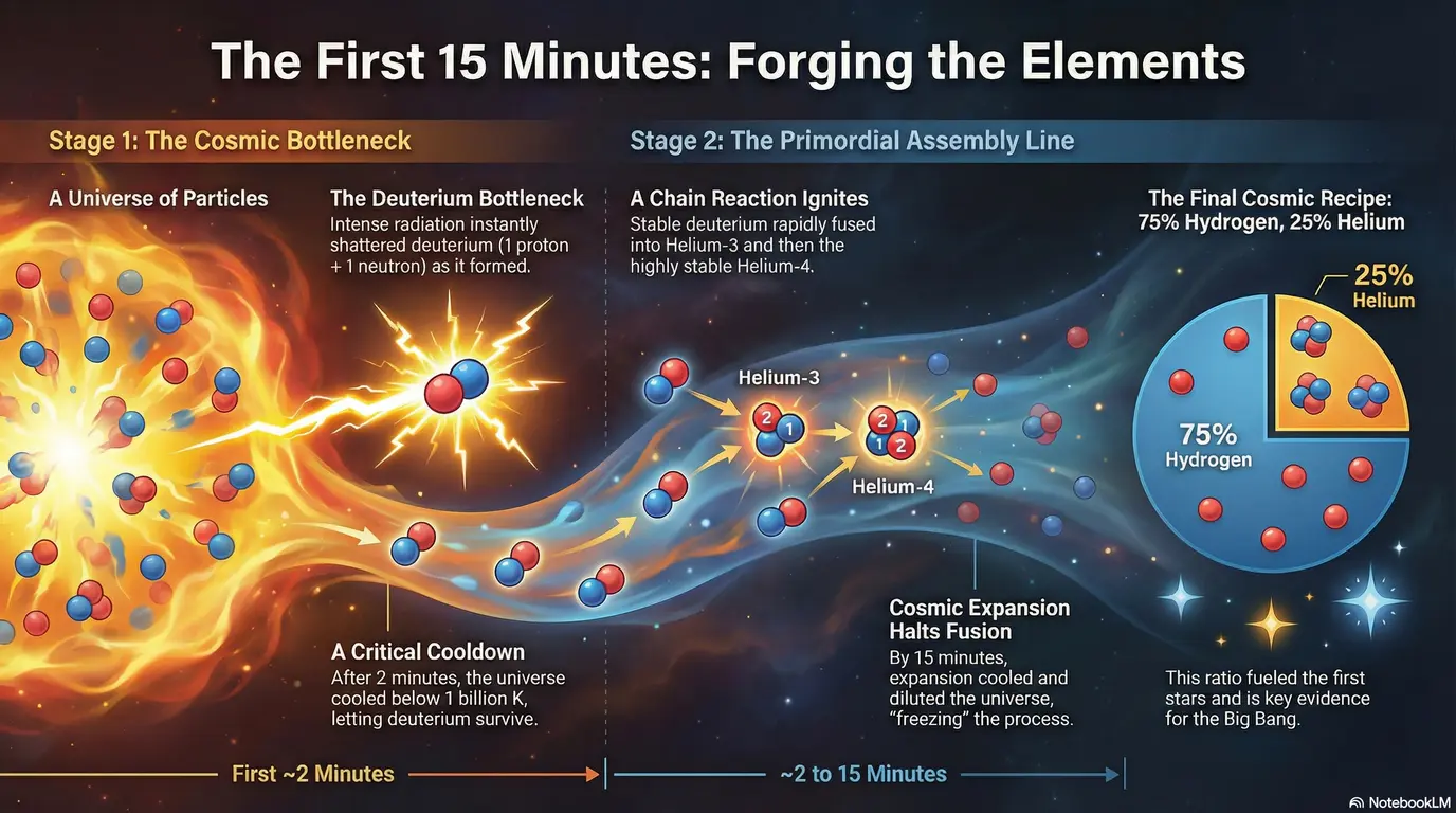Immediately after the Big Bang, the universe was a blazing furnace of energy where temperatures were too extreme for even simple atoms to survive. Within microseconds, the cosmos cooled enough for fundamental quarks to combine into protons (made of two “up” and one “down” quark) and neutrons (made of one “up” and two “down” quarks). However, the path to building heavier elements was blocked by the “deuterium bottleneck.” For several minutes, intense radiation acted like a cosmic hammer, instantly shattering deuterium—a “heavy” hydrogen isotope made of one proton and one neutron—as soon as it formed. This fragile stepping stone was vital for cosmic evolution but could not endure the heat until the temperature fell below 1 billion Kelvin. Roughly two minutes after the start of time, the radiation finally eased, allowing deuterium to survive and triggering the next stage of creation.