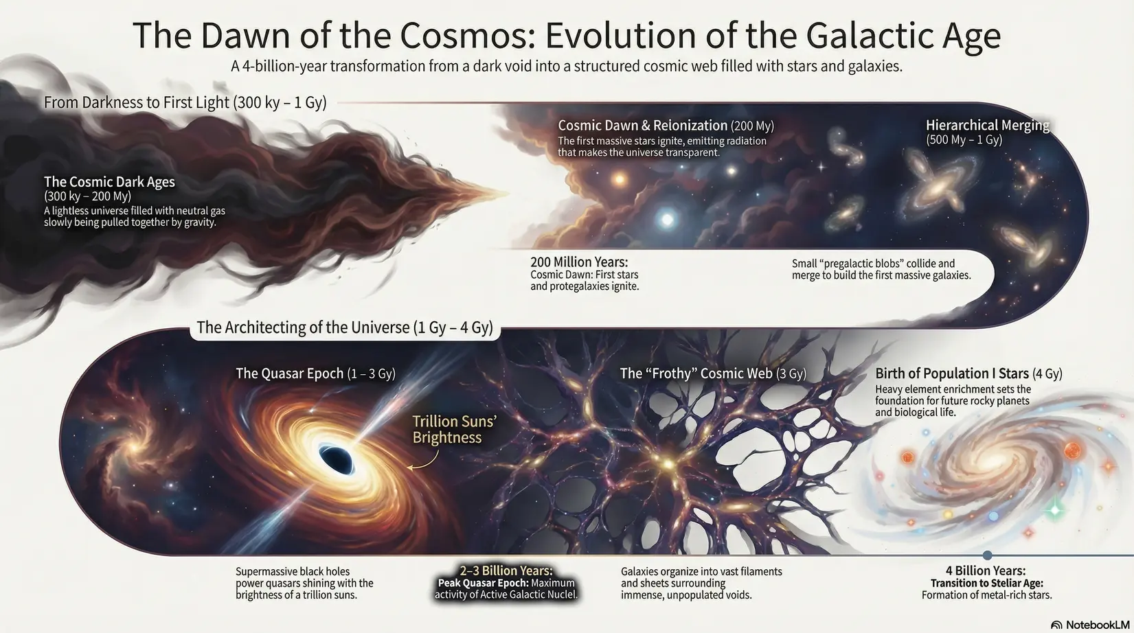 Following the epochs of recombination and decoupling at the end of the Particle Age, the universe became electrically neutral and transparent as electrons and protons combined to form hydrogen and helium atoms. However, this transition ushered in a prolonged Dark Ages spanning hundreds of millions of years. During this era, the primordial fireball had dimmed and the first luminous stars had yet to ignite, leaving the cosmos in absolute darkness even as it continued its rapid expansion. Simultaneously, the influence of gravity began to pull unseen dark matter and neutral gas into increasingly dense concentrations, constructing the fundamental scaffolding of the cosmos.