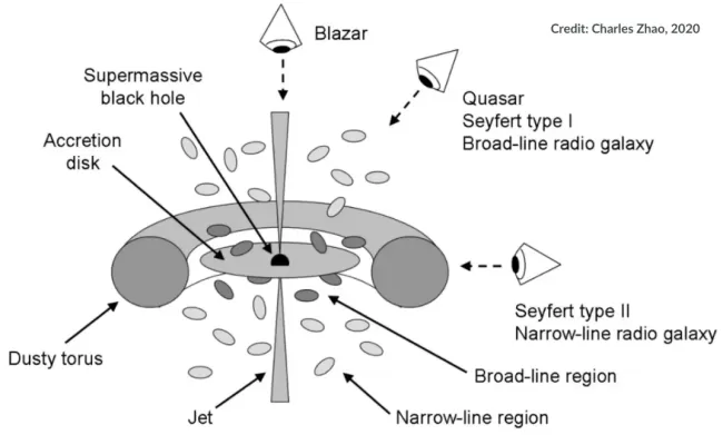 Active galaxies are highly luminous systems whose extraordinary energy output—which cannot be explained by the combined light of stars—originates from a compact central region known as an active galactic nucleus (AGN). According to the accepted standard model of AGN (pictured above), the central engine powering all AGNs is a supermassive black hole that is actively consuming material from a rapidly rotating, superheated accretion disk. Gas orbiting very close to the black hole’s intense gravitational field moves at incredibly high speeds, generating “broad emission lines” in the object’s spectrum, while gas located further out moves more slowly and produces “narrow emission lines”. This inner accretion disk and broad-line region are typically enveloped by a thicker, donut-shaped torus of dust and gas, and the black hole may also eject high-speed jets of particles into space.