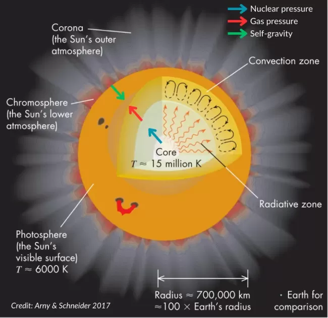 At the heart of our solar system, the Sun is a dynamic sphere of plasma held together by a delicate, ongoing battle of physical forces, as illustrated in the cross-section above. Deep within its core, where temperatures soar to an unimaginable 15 million Kelvin, extreme conditions ignite continuous nuclear fusion reactions. This intense nuclear activity generates a powerful outward push, represented by the blue arrows of nuclear pressure. Simultaneously, the immense mass of the Sun exerts a relentless inward pull, shown by the green arrows of self-gravity. To prevent the star from collapsing under its own weight, the outward nuclear pressure combines with the outward thermal gas pressure (red arrows). This perfect balance of opposing forces stabilizes the Sun.