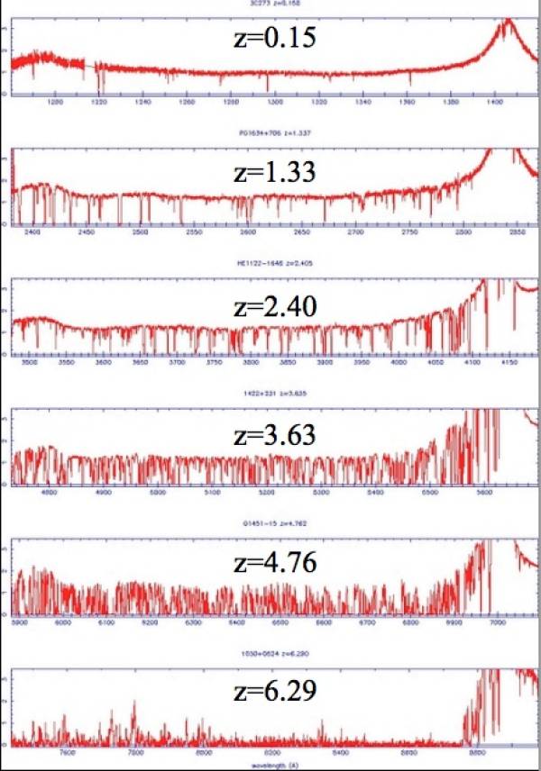 The Lyman-$\alpha$ forest is a dense profusion of narrow absorption lines appearing on the blue side of a quasar’s $Ly\alpha$ emission line.