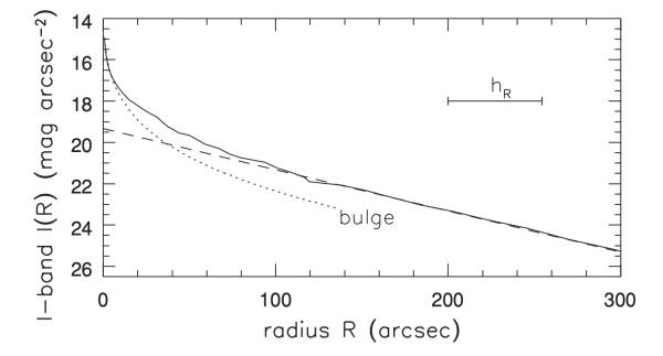 Bulges and Ellipticals: These systems are often modeled using the Sérsic formula: $I(R) = I(0) \exp[-(R/R_0)^{1/n}]$. A specific version of this where $n=4$ is known as the de Vaucouleurs $R^{1/4}$ law, which provides a good description for luminous elliptical galaxies.