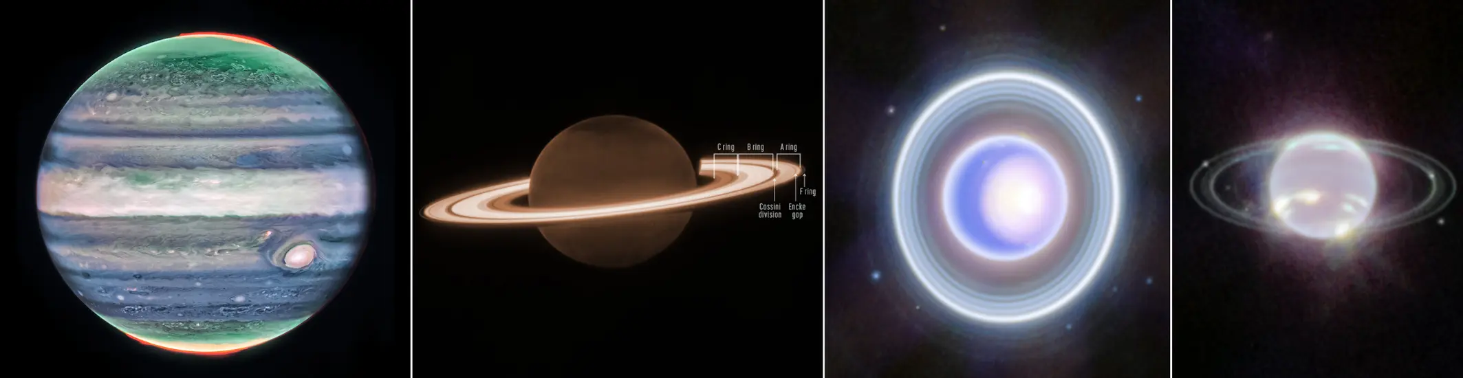 Only Voyager 2 has flown by Uranus and Neptune, now moving beyond the solar system into the interstellar medium. It flew closest to Uranus in 1985 and Neptune at 4,800 km in 1989. It discovered 10 new moons and two new rings on Uranus, and six new moons and four rings on Neptune. The best images of the four gas giants to date have been captured by the Webb Telescope, shown below.