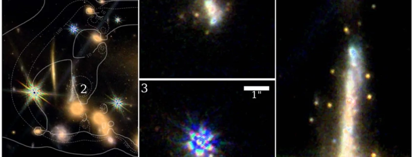 The Sparkler Galaxy (figure above) is a highly magnified, distant system located approximately 9 billion light-years away from us, first reported by Golubchik et al. (2022). Surrounding the galaxy is a set of relatively bright point-like sources (AB ∼ 27 mag), referred to as “sparkles” (Figure 1, right). Previous studies (Mowla & Iyer et al. 2022; Claeyssens et al. 2023) suggest that these sparkles are likely ancient globular clusters (GCs). And star clusters in other lensed galaxies in these cluster none show a population as old as the Sparkler (Claeyssens et al. 2023; Vanzella et al. 2022). However, since the conclusions were drawn primarily from photometric data with significant parameter uncertainties, alternative interpretations—such as younger stellar clusters or even ultra-compact satellites—remain possible.
