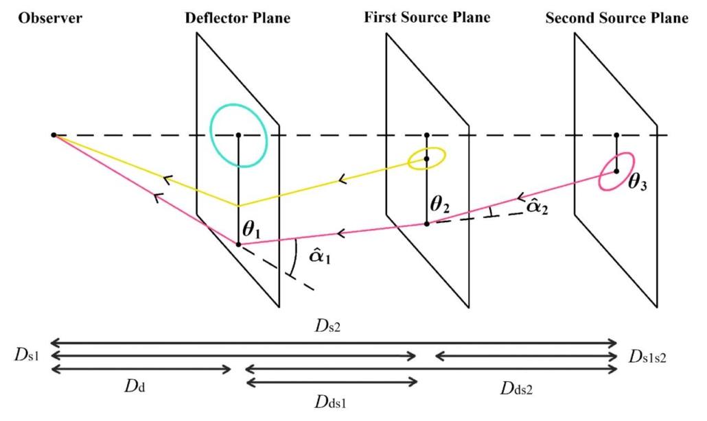 Abstract: Double-source-plane strong gravitational lenses (DSPLs), with two sources at different redshifts, are independent cosmological probes of the dark energy equation of state parameter $w$ and the matter density parameter $\Omega_m$. We present the lens model for the DSPL AGEL035346–170639 and infer cosmological constraints from this system for flat $\Lambda$ cold dark matter and flat $w$CDM cosmologies. From the joint posterior of $w$ and $\Omega_m$ in the flat $w$CDM cosmology, we extract the following median values and $1\sigma$ uncertainties: $w = -1.52^{+0.49}_{-0.33}$ and $\Omega_m = 0.192^{+0.305}_{-0.131}$ from AGEL0353 alone. Combining our measurements with two previously analyzed DSPLs, we present the joint constraint on these parameters from a sample of three, the largest galaxy-scale DSPL sample used for cosmological measurement to date. The combined precision of $w$ from three DSPLs is higher by 15\% over AGEL0353 alone. Combining DSPL and cosmic microwave background (CMB) measurements improves the precision of $w$ from CMB-only constraints by 39\%, demonstrating the complementarity of DSPLs with the CMB. Despite their promising constraining power, DSPLs are limited by sample size, with only a handful discovered so far. Although ongoing and near-future wide-area sky surveys will increase the number of known DSPLs by up to two orders of magnitude, these systems will still require dedicated high-resolution imaging and spectroscopic follow-ups like those presented in this paper. Our ASTRO 3D Galaxy Evolution with Lenses collaboration is undertaking such follow-up campaigns for several newly discovered DSPLs and will provide cosmological measurements from larger samples of DSPLs in the future.