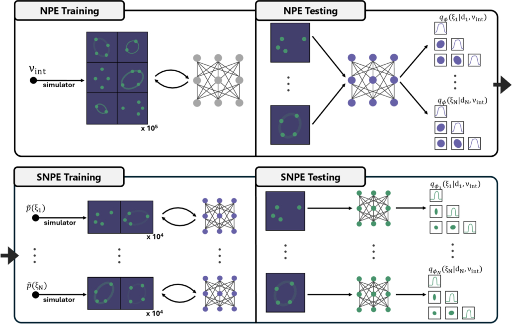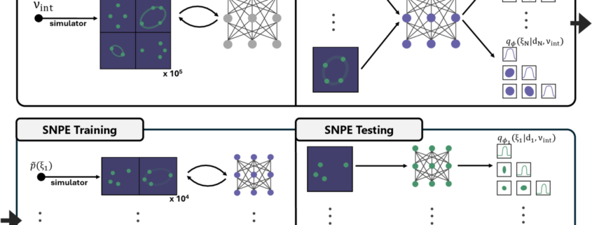 Abstract: Strongly lensed quasars can be used to constrain cosmological parameters through time-delay cosmography. Models of the lens masses are a necessary component of this analysis. To enable time-delay cosmography from a sample of $\mathcal{O}(10^3)$ lenses, which will soon become available from surveys like the Rubin Observatory’s Legacy Survey of Space and Time and the Euclid Wide Survey, we require fast and standardizable modeling techniques. To address this need, we apply neural posterior estimation (NPE) for modeling galaxy-scale strongly lensed quasars from the Strong Lensing Insights into the Dark Energy Survey (STRIDES) sample. NPE brings two advantages: speed and the ability to implicitly marginalize over nuisance parameters. We extend this method by employing sequential NPE to increase precision of mass model posteriors. We then fold individual lens models into a hierarchical Bayesian inference to recover the population distribution of lens mass parameters, accounting for out-of-distribution shift. After verifying our method using simulated analogs of the STRIDES lens sample, we apply our method to 14 Hubble Space Telescope single-filter observations. We find the population mean of the power-law elliptical mass distribution slope, $\gamma_{\rm lens}$, to be $\mathcal{M}{\gamma{\rm lens}} = 2.13 \pm 0.06$. Our result represents the first population-level constraint for these systems. This population-level inference from fully automated modeling is an important stepping stone toward cosmological inference with large samples of strongly lensed quasars.